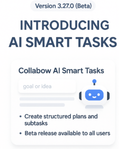 ✨We’re excited to announce the beta release of Collabow AI Smart Tasks, a breakthrough feature designed to redefine how you manage projects and tasks. This innovation brings intelligent automation into your workspace, helping you plan, organise, and execute ideas with ease. Simply type your goal or idea into the AI description box, and Collabow will automatically create structured plans and subtasks, transforming your thoughts into clear, actionable workflows in seconds. This release also includes a series of bug fixes, upgrades, and general improvements to make your experience faster, smoother, and more reliable. AI Smart Tasks (Beta) is available across all Collabow packages. As this is an early beta release, we’re inviting our community to share feedback and ideas to help us shape and refine the feature over the coming weeks and months. Your insights will directly influence how Smart Tasks evolves into one of the most powerful productivity tools on the platform. Collabow continues to evolve – powered by you, and built for the future of work.